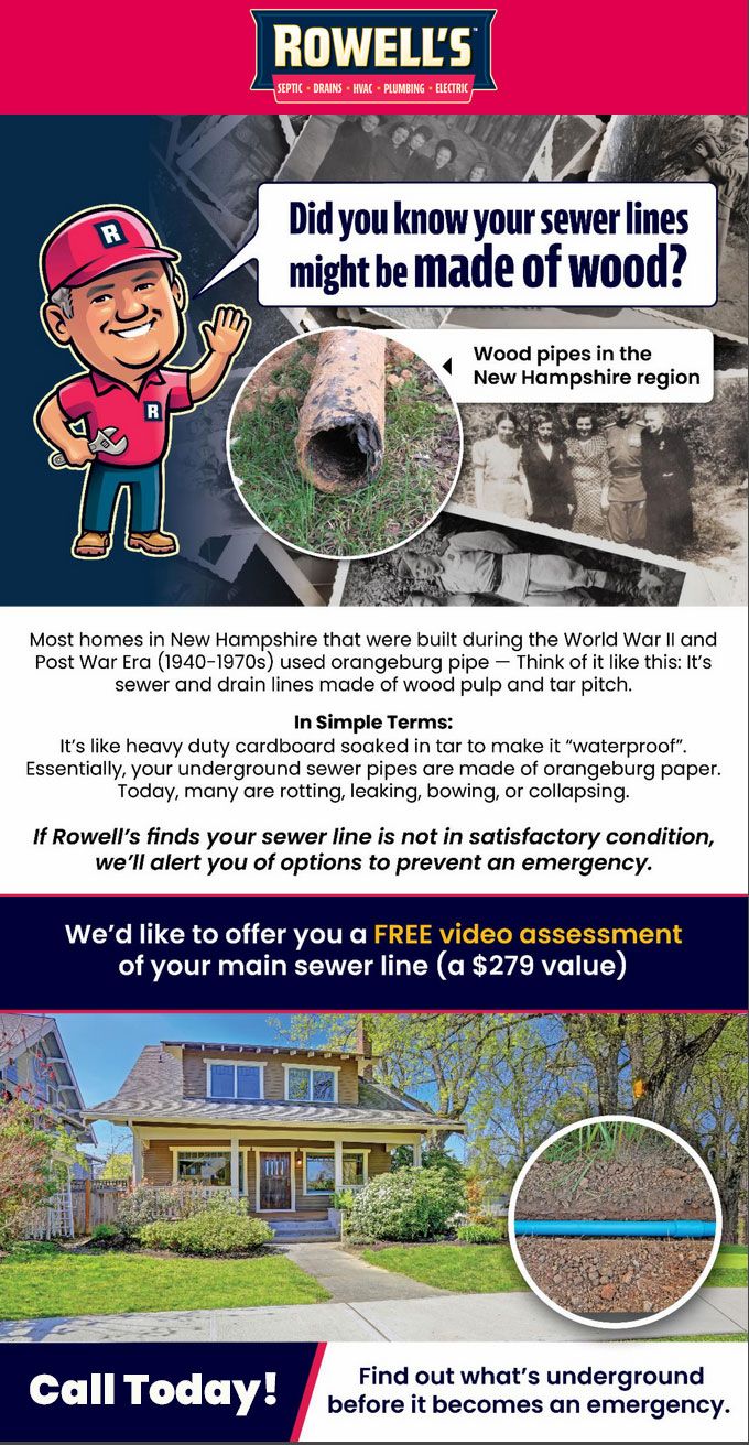 Most homes in Wolfeboro built during World War II and the post-war era (1940s–1970s) used Orangeburg pipe — sewer and drain lines made of wood pulp and tar pitch.