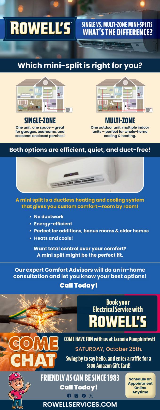 "Friendly As Can Be Since 1983!" When you need help with your plumbing, drains, heating, cooling or electrical in Wolfeboro, you can always rely on Rowell's Services! Call us now or book online!